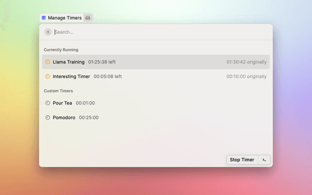 Start, stop, and save countdown timers, directly in Raycast, with no external dependencies.