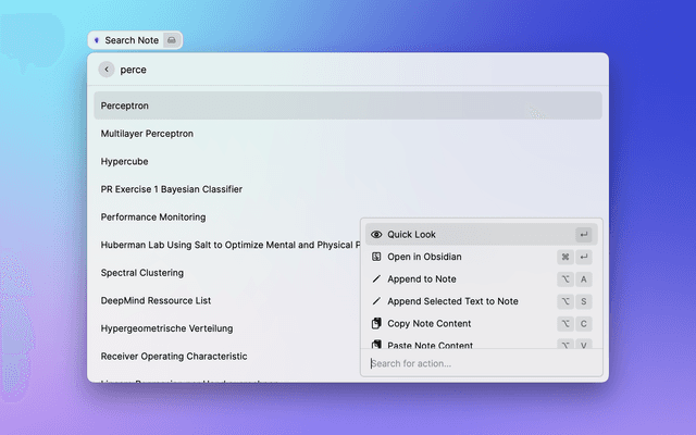 This is a raycast extension with commands for the note taking and knowledge management app Obsidian. To use it, install the extension from the Raycast Store, open Raycast Search and type one of the following commands: